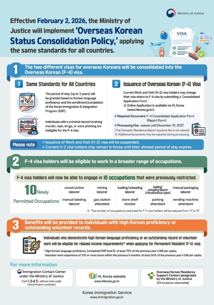 The H-2 visa is generally available to overseas Koreans who meet eligibility requirements under the Working Visit program.