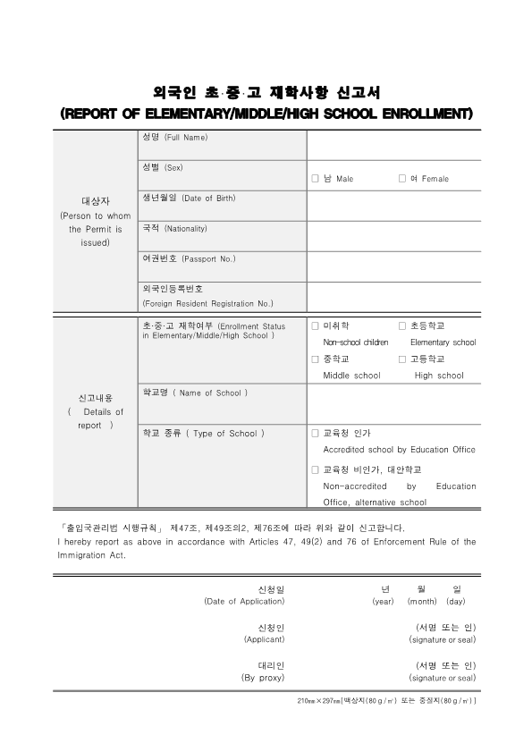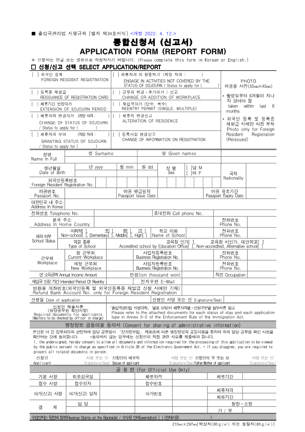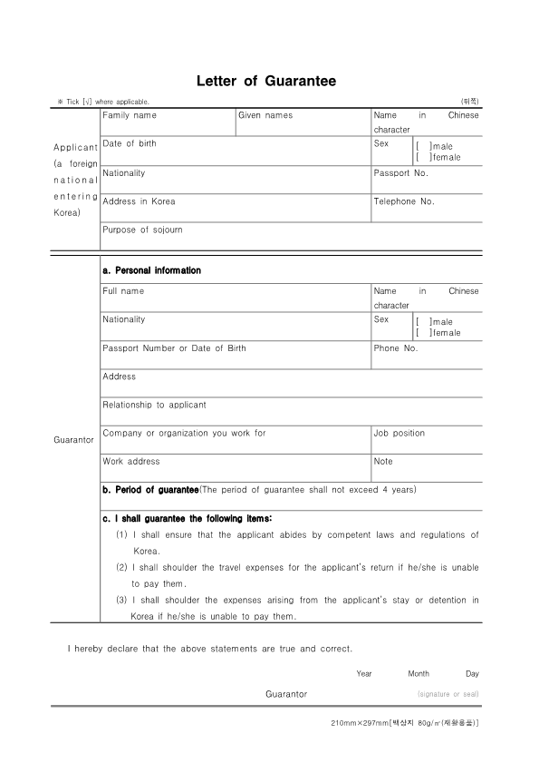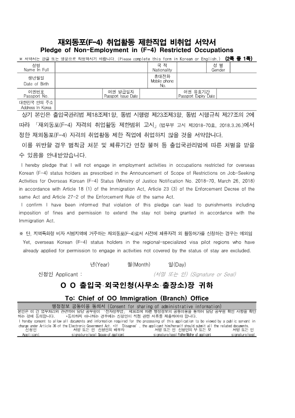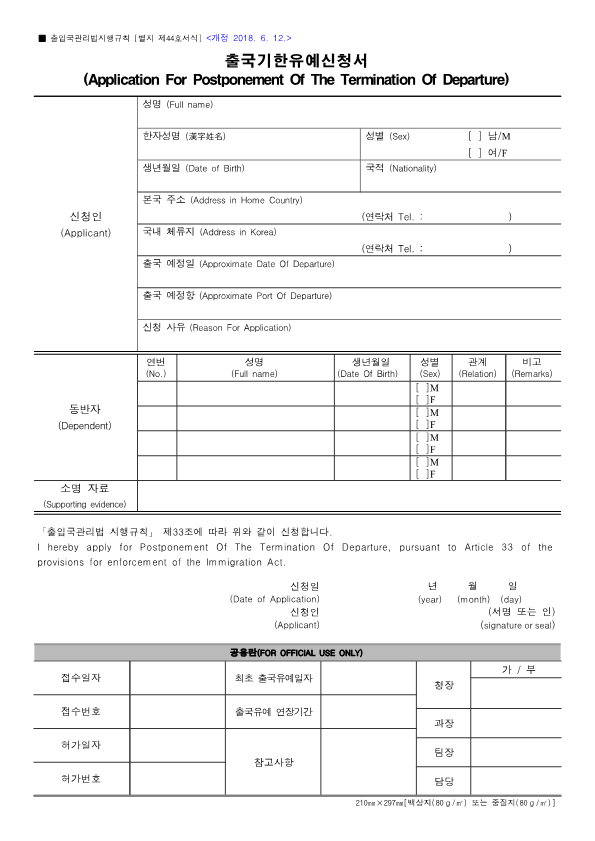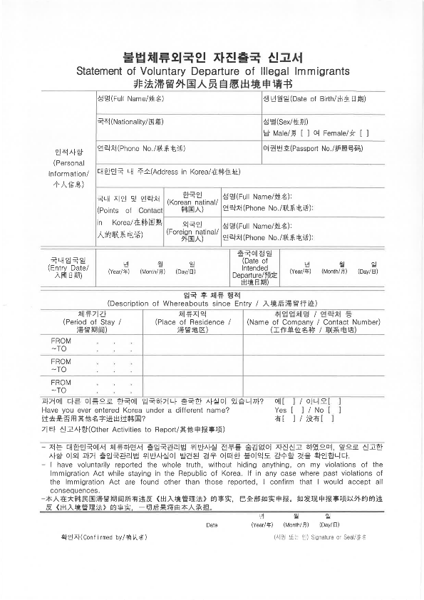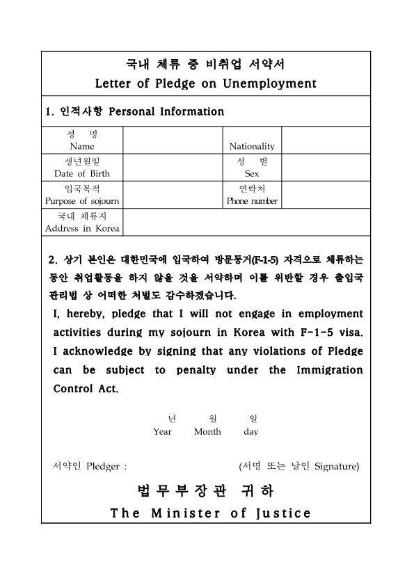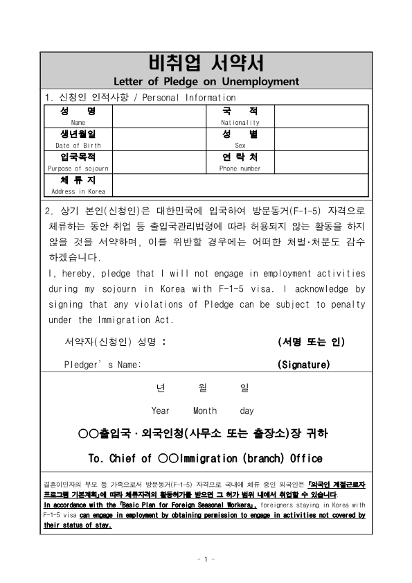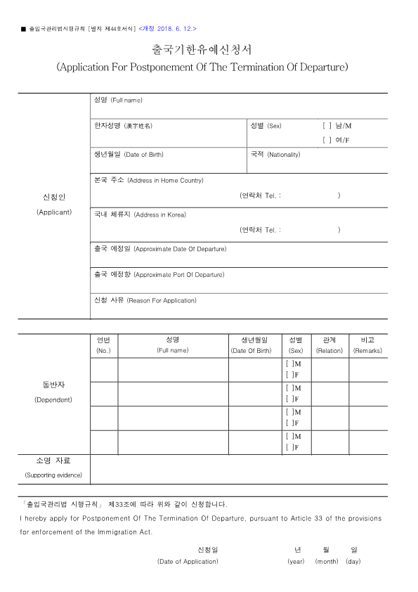 Stay in Korea Forms Download immigration forms related to staying in Korea. Withdrawal of Application Including Permission of Stay View Form Status of Language Trainees View Form Statement of Reasons for Extension of Training Period View Form Statement of Voluntary Departure of Illegal Immigrants View Form report on occurrence of changes concerning employed or trainee foreign nationals View Form report of elementary middle high school enrollment View Form Pledge of Non-Employment in Restricted Occupations for Overseas Koreans (F-4) View Form Pledge by Employer and Applicant View Form Letter of Pledge on Unemployment View Form Letter of Pledge on Unemploymen-cn View Form Letter of Guarantee-ko View Form Letter of Guarantee-en View Form K-point E74 Point System Self Evaluation Sheet View Form K-point E74 Foreigner Personal Description View Form K-POINT E-7-4 Employer Recommendation Form View Form International Student Status View Form Industrial Training (D-3) Training Plan View Form Industrial Training (D-3) Training Log View Form Guidelines and Important Notes for Holders of Non-Employment and Visiting Employment (H-2) Stay Status View Form FOREIGNER OCCUPATION REPORT FORM View Form Employment Commencement Report for H-2 Overseas Koreans View Form Confirmation of Stay Within Passport Validity Period View Form Confirmation of Residence Accommodation Provision_CN View Form Confirmation of ResidenceAccommodation View Form Basic Information of Permanent Residence (F-5) Status Applicant View Form Confirmation of Compliance with Part-Time Employment Requirements for International Students View Form Confirmation of Part-Time Employment for Foreign Students View Form Application for Parallel Entry of Korean Name on Alien Registration Card_en View Form Application For Postponement Of The Termination Of Departure View Form APPLICATION FORM (REPORT FORM) View Form Application for Deferral of Departure Deadline View Form Application for Parallel Entry of Korean Name on Alien Registration Card (Residence Report Certificate) View Form Application for Parallel Entry of Korean Name on Alien Registration Card_cn View Form