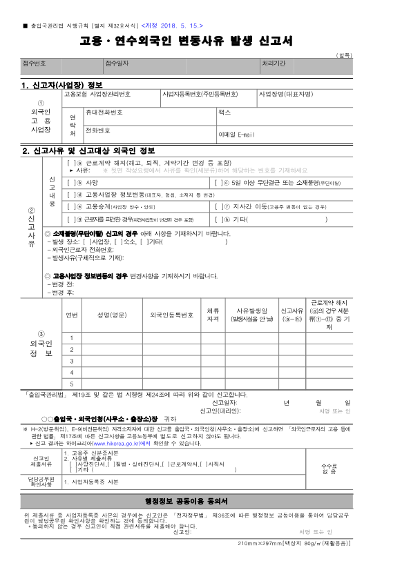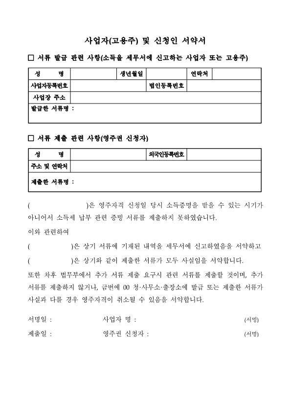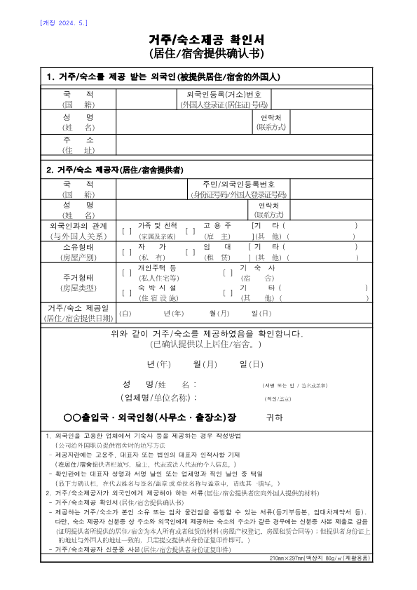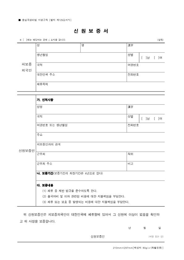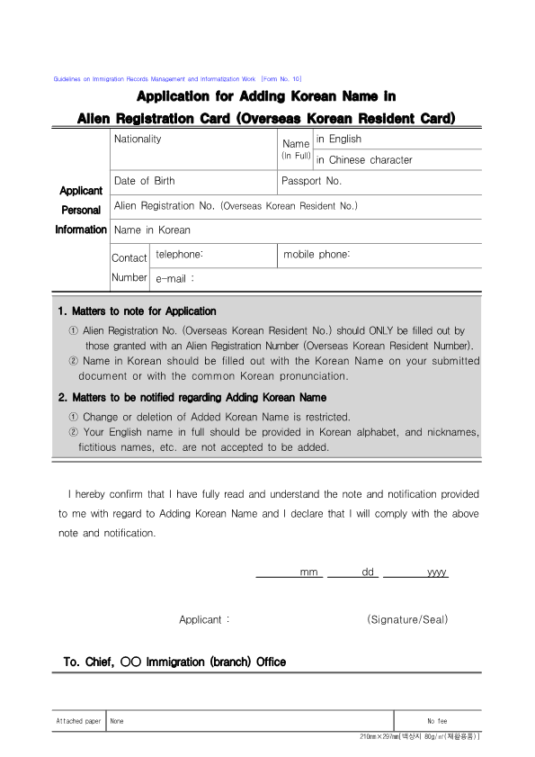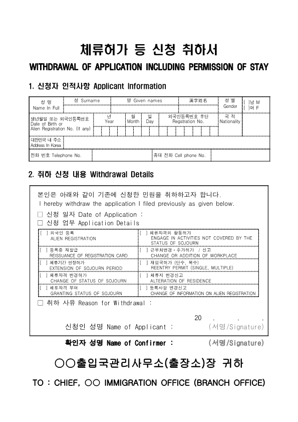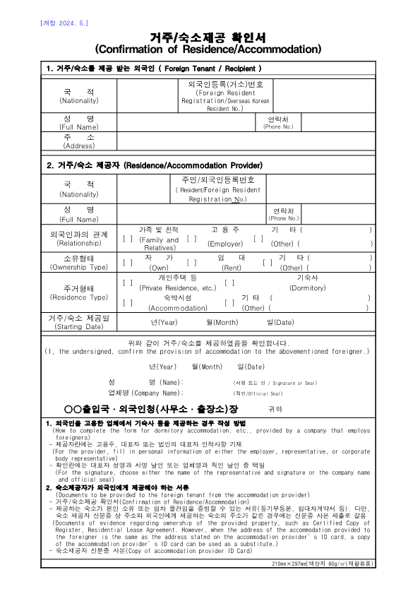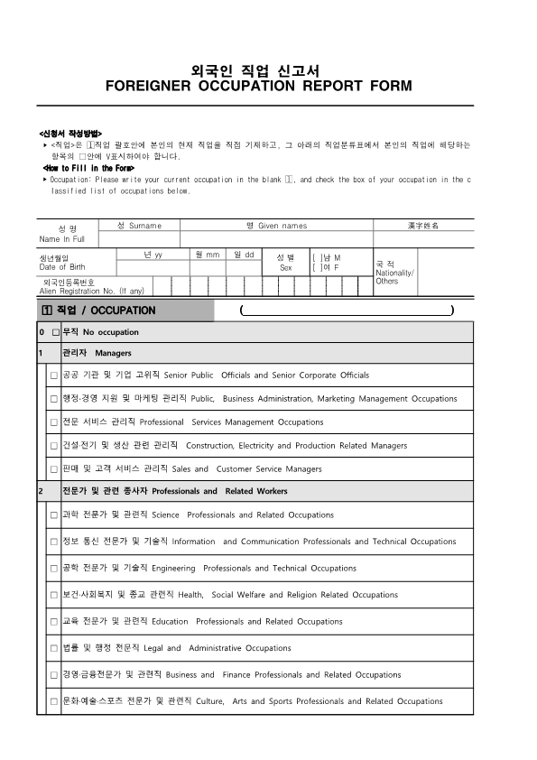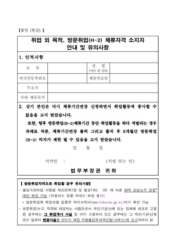 Stay in Korea Forms Download immigration forms related to staying in Korea. Withdrawal of Application Including Permission of Stay View Form Status of Language Trainees View Form Statement of Reasons for Extension of Training Period View Form Statement of Voluntary Departure of Illegal Immigrants View Form report on occurrence of changes concerning employed or trainee foreign nationals View Form report of elementary middle high school enrollment View Form Pledge of Non-Employment in Restricted Occupations for Overseas Koreans (F-4) View Form Pledge by Employer and Applicant View Form Letter of Pledge on Unemployment View Form Letter of Pledge on Unemploymen-cn View Form Letter of Guarantee-ko View Form Letter of Guarantee-en View Form K-point E74 Point System Self Evaluation Sheet View Form K-point E74 Foreigner Personal Description View Form K-POINT E-7-4 Employer Recommendation Form View Form International Student Status View Form Industrial Training (D-3) Training Plan View Form Industrial Training (D-3) Training Log View Form Guidelines and Important Notes for Holders of Non-Employment and Visiting Employment (H-2) Stay Status View Form FOREIGNER OCCUPATION REPORT FORM View Form Employment Commencement Report for H-2 Overseas Koreans View Form Confirmation of Stay Within Passport Validity Period View Form Confirmation of Residence Accommodation Provision_CN View Form Confirmation of ResidenceAccommodation View Form Basic Information of Permanent Residence (F-5) Status Applicant View Form Confirmation of Compliance with Part-Time Employment Requirements for International Students View Form Confirmation of Part-Time Employment for Foreign Students View Form Application for Parallel Entry of Korean Name on Alien Registration Card_en View Form Application For Postponement Of The Termination Of Departure View Form APPLICATION FORM (REPORT FORM) View Form Application for Deferral of Departure Deadline View Form Application for Parallel Entry of Korean Name on Alien Registration Card (Residence Report Certificate) View Form Application for Parallel Entry of Korean Name on Alien Registration Card_cn View Form
