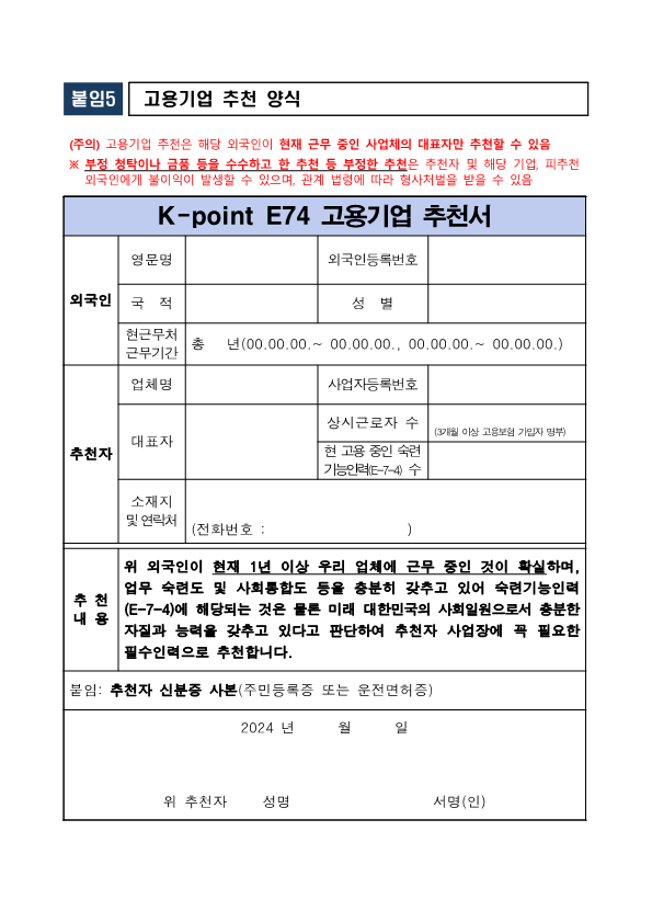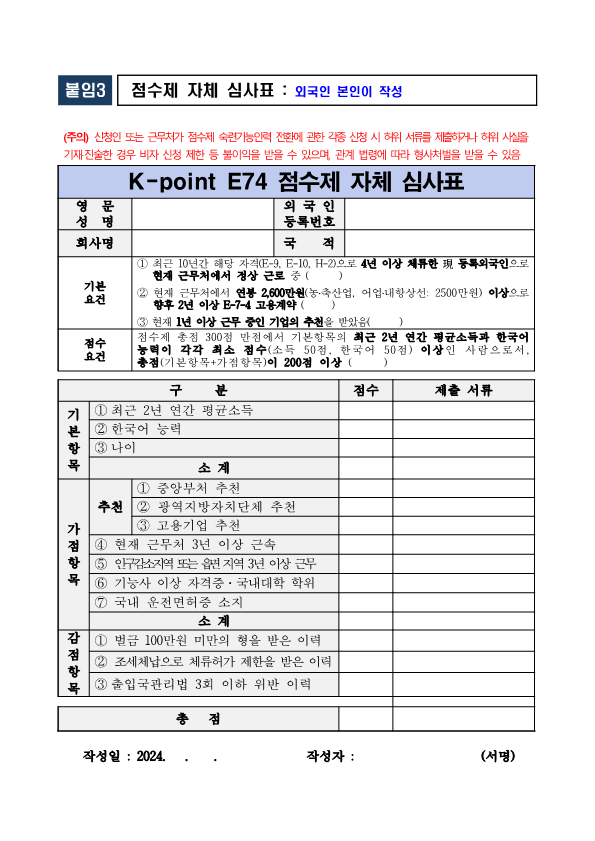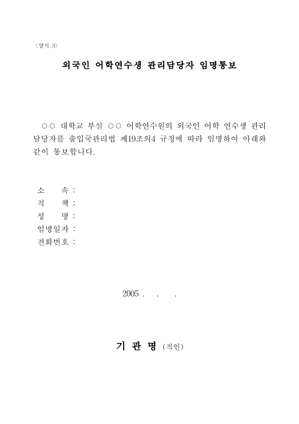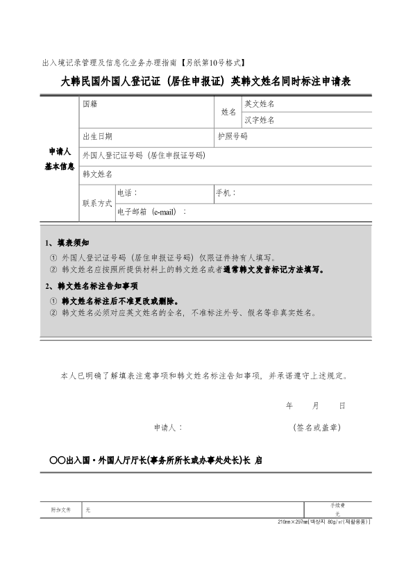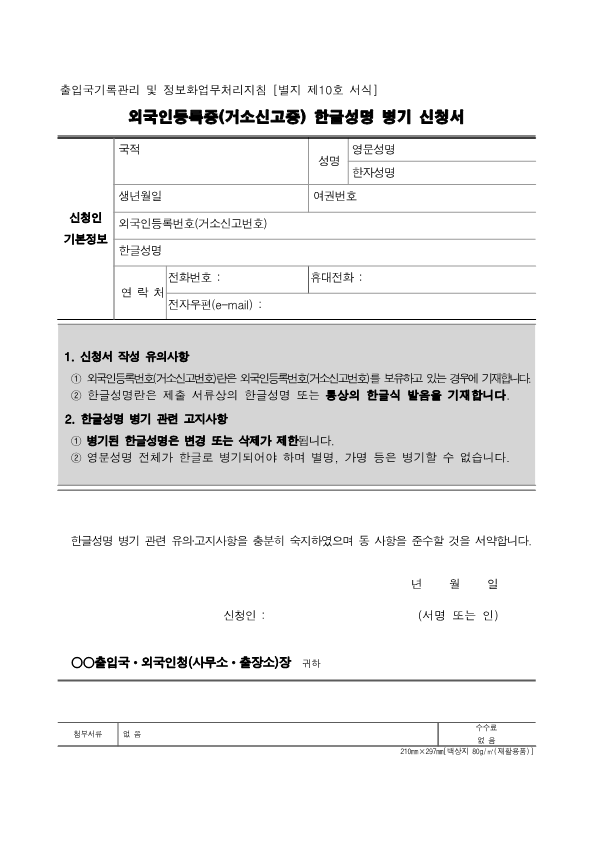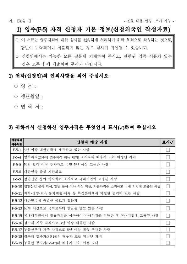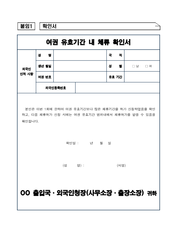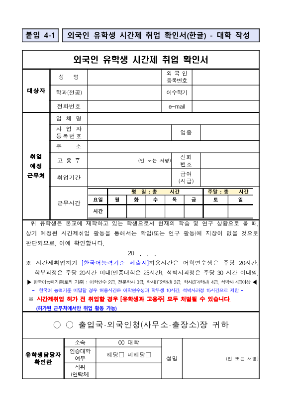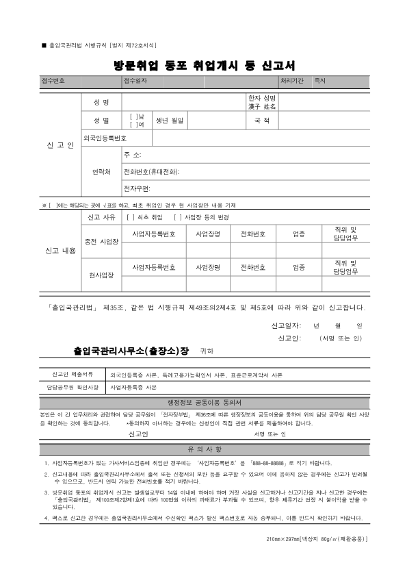 Stay in Korea Forms Download immigration forms related to staying in Korea. Withdrawal of Application Including Permission of Stay View Form Status of Language Trainees View Form Statement of Reasons for Extension of Training Period View Form Statement of Voluntary Departure of Illegal Immigrants View Form report on occurrence of changes concerning employed or trainee foreign nationals View Form report of elementary middle high school enrollment View Form Pledge of Non-Employment in Restricted Occupations for Overseas Koreans (F-4) View Form Pledge by Employer and Applicant View Form Letter of Pledge on Unemployment View Form Letter of Pledge on Unemploymen-cn View Form Letter of Guarantee-ko View Form Letter of Guarantee-en View Form K-point E74 Point System Self Evaluation Sheet View Form K-point E74 Foreigner Personal Description View Form K-POINT E-7-4 Employer Recommendation Form View Form International Student Status View Form Industrial Training (D-3) Training Plan View Form Industrial Training (D-3) Training Log View Form Guidelines and Important Notes for Holders of Non-Employment and Visiting Employment (H-2) Stay Status View Form FOREIGNER OCCUPATION REPORT FORM View Form Employment Commencement Report for H-2 Overseas Koreans View Form Confirmation of Stay Within Passport Validity Period View Form Confirmation of Residence Accommodation Provision_CN View Form Confirmation of ResidenceAccommodation View Form Basic Information of Permanent Residence (F-5) Status Applicant View Form Confirmation of Compliance with Part-Time Employment Requirements for International Students View Form Confirmation of Part-Time Employment for Foreign Students View Form Application for Parallel Entry of Korean Name on Alien Registration Card_en View Form Application For Postponement Of The Termination Of Departure View Form APPLICATION FORM (REPORT FORM) View Form Application for Deferral of Departure Deadline View Form Application for Parallel Entry of Korean Name on Alien Registration Card (Residence Report Certificate) View Form Application for Parallel Entry of Korean Name on Alien Registration Card_cn View Form