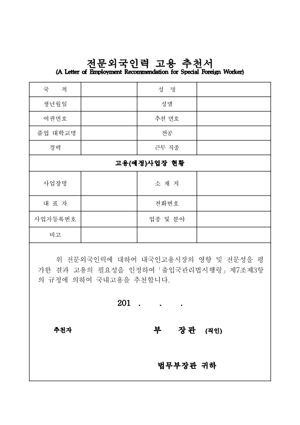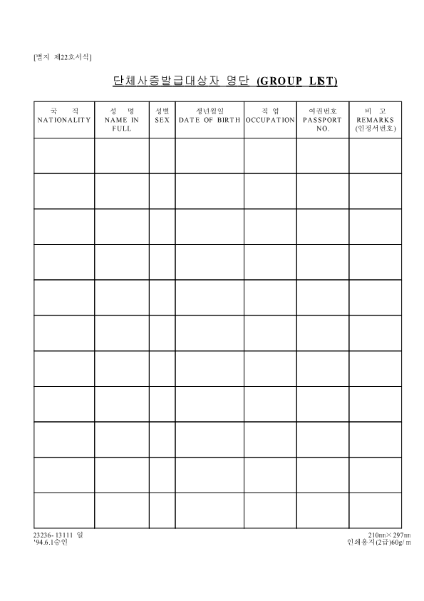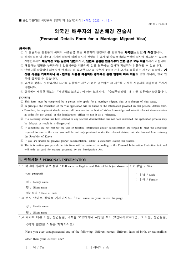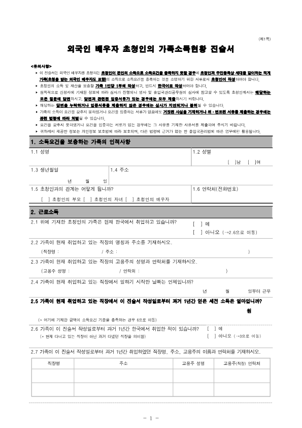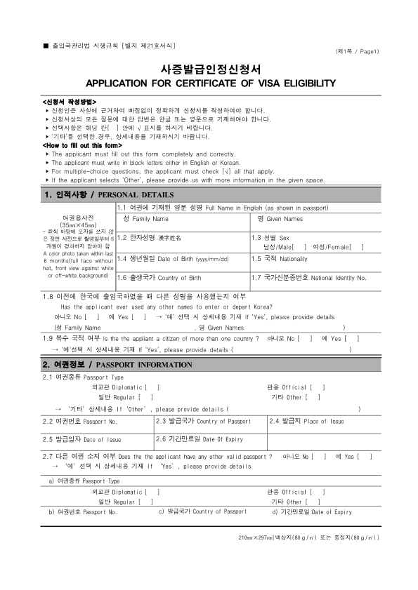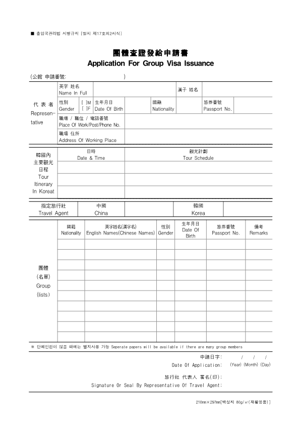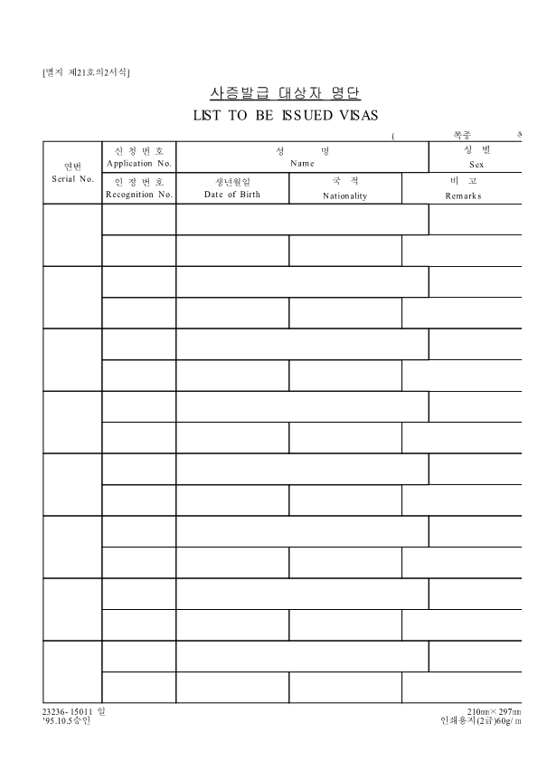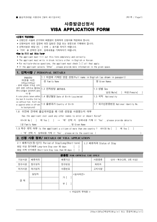 Visa Issuance Download immigration forms related to staying in Korea. Statement of Family Income of the Inviter of a Foreign Spouse View Form Visa Application Form (For Applicants with a Certificate of Visa Issuance) View Form VISA APPLICATION FORM View Form Personal Details Form for a Marriage Migrant Visa View Form Personal Details Form for F-2-3 Visa View Form Pledge to Prevent Illegal Stay and Unauthorized Employment View Form Invitation Letter for a Foreign Spouse View Form List of Applicants Eligible for Group Visa Issuance View Form List to be Issued Visas View Form Invitation Letter for Foreign Spouse Visa View Form Invitation Letter for Family Members of a Marriage Immigrant (F-1-5 Visa Application) View Form Health Statement for E-2 (Conversation Instructor) Visa Applicants View Form Confirmation of Invitation for a Foreign Patient View Form Confirmation of Visa Applicant (E-9 E-10 H-2 Status) View Form Consular Interview Checklist for E-2 (Conversation Instructor) Visa Applicants View Form Application for Invalidation of Group Electronic Visa View Form 團體査證發給申請書 Application For Group Visa Issuance View Form Application for certificate of visa eligibility View Form A Letter of Employment Recommendation for Special Foreign Worke View Form
